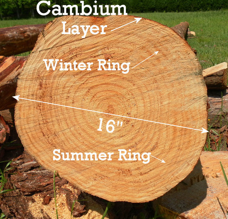Amazingly, as the trees lie on the ground, the insects move in as if drawn by some powerful hand. The first ones bore easily through the bark into the “skin” of the tree. It is called the cambium layer. This is a very thin area of tissue that carries the moisture and nutrients from the roots into the tree’s branches and out to the needles. It is relatively soft – it reminds me of bamboo shoots. Fibrous, soft but also stringy. Here is a cross section of a tree: