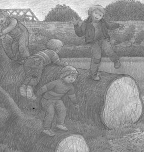 When Dad cuts down the chestnut tree, He'll make such things for you and me... A rocking horse to ride all day A fort where all my soldiers stay. A wheelbarrow painted blue, A faithful duck on wheels for you. Stilts to make us very tall, Colored blocks to build a wall. When the tree is on the ground, All my friends will come around. On the trunk we'll jump and climb, We will have a lovely time! No more tearing jacket sleeves, No more sweeping up of leaves. And when I'm tucked into my bed, Kisses kissed and goodnights said, The tree won't scare me any more, When the night wind makes it roar. If there wasn't any tree What difference would it make to me? No tree house - that's the worst of all - To hide in when we hear Mom call. No cool places in the shade, When we have run and jumped and played. No leaves to kick and throw about And roll each other in and shout. No sticks to find on chilly days, To make our winter fires blaze. And there is another thing - What will happen to our swing? Where will owl and squirrel stay If the tree is hauled away? If the tree is really gone, What can I hang my birdhouse on? Suddenly we're not so sure We want it cut down any more. Trees are special, large or small, So Dad - don't cut it down at all! (When Dad Cuts Down the Chestnut Tree by Pam Ayres, illus by Graham Percy; Walker Books, London, 1988)